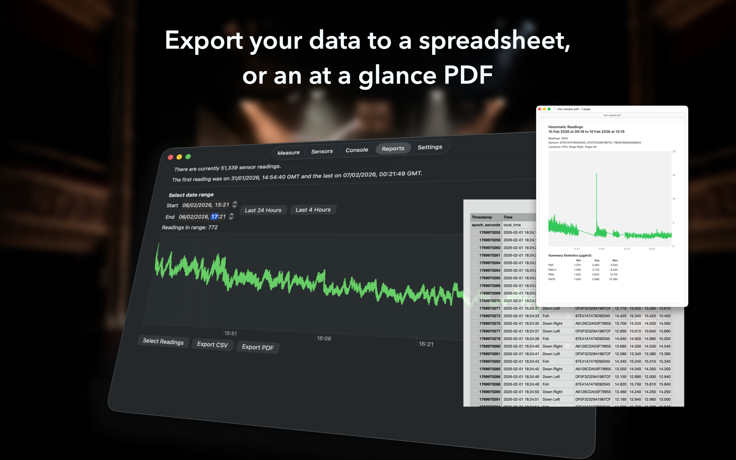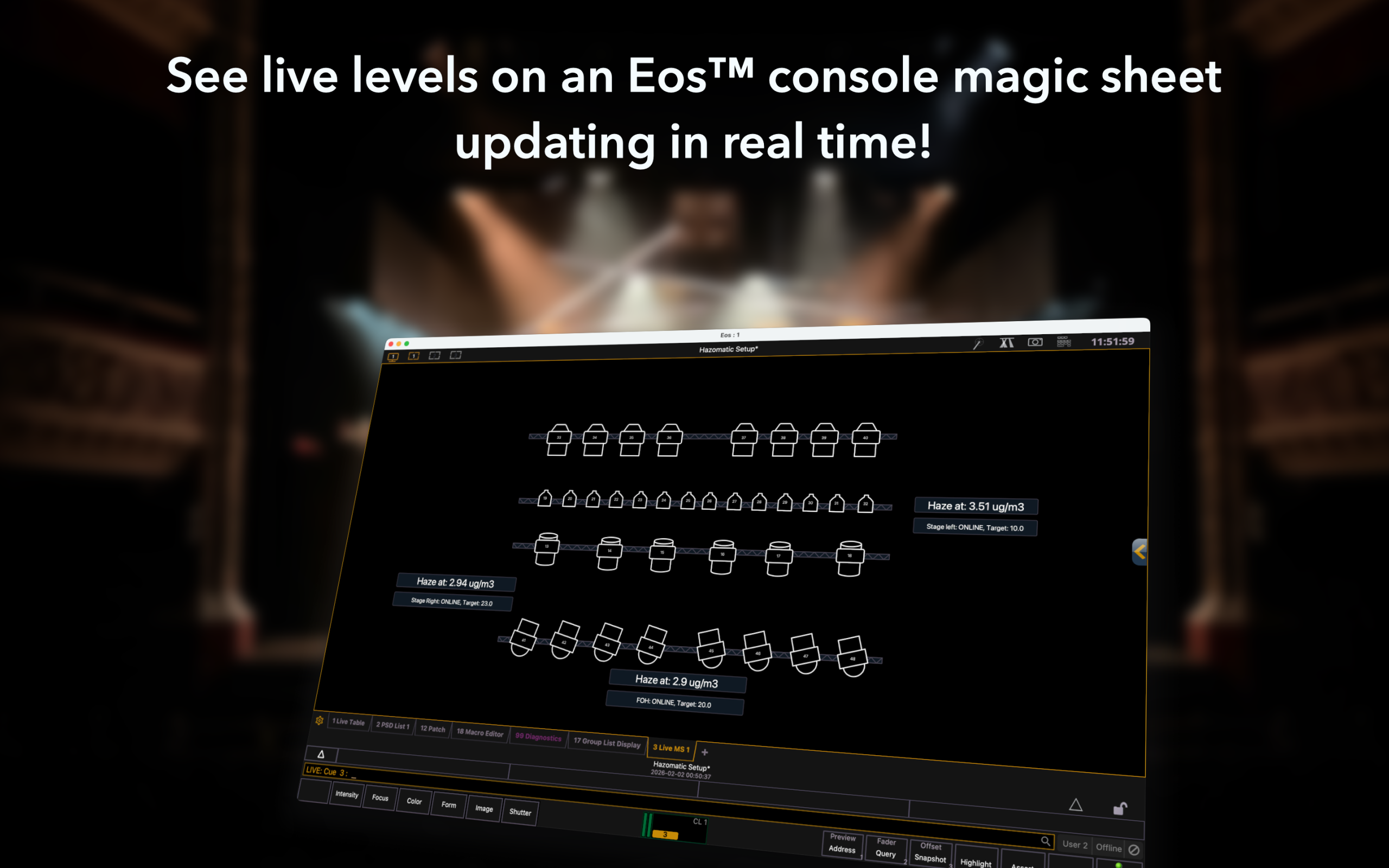 Hazomatic is a macOS application designed for monitoring airborne particulate levels in theatrical environments and integrating those measurements into your lighting workflow.