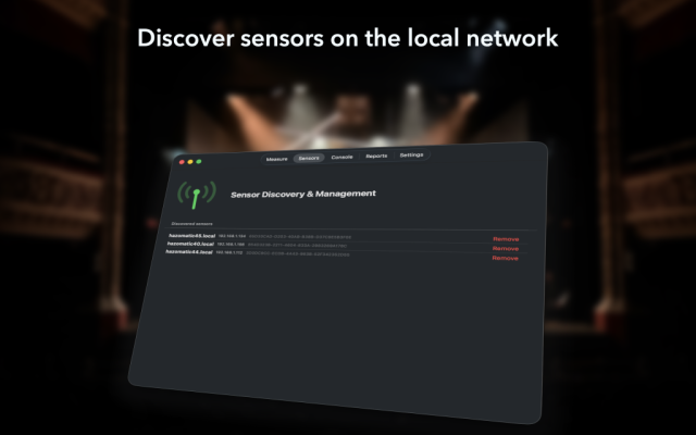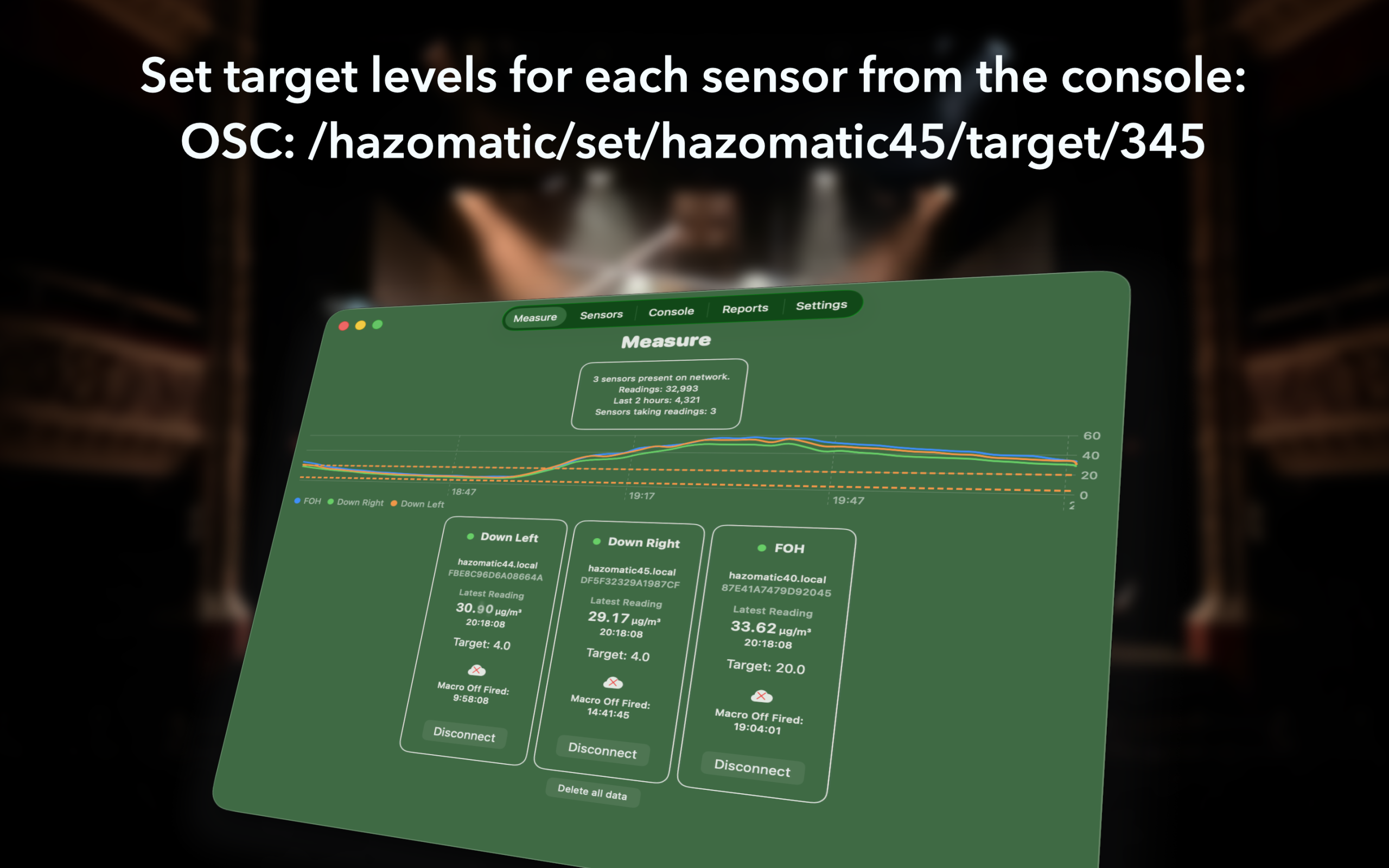 If you choose, Hazomatic can also notify your lighting console via OSC when user-defined thresholds are crossed. Display live levels or trigger programmed macros — the response is entirely yours.