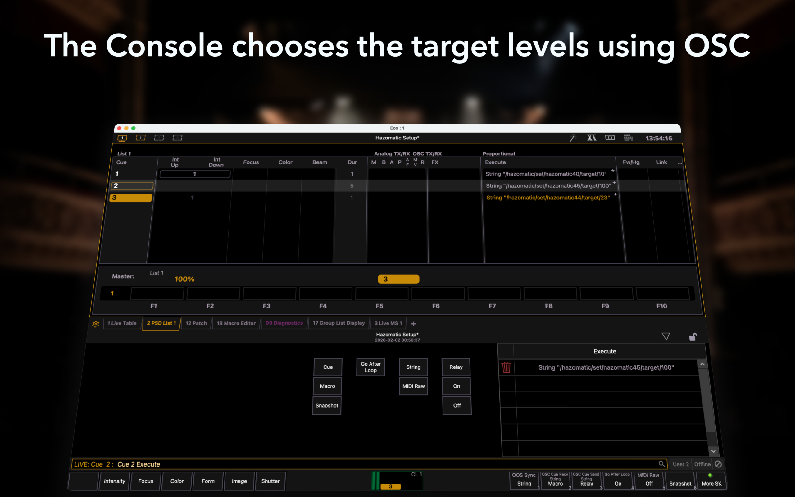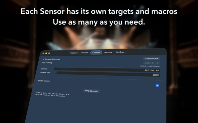 Hazomatic can connect to ETC Eos (other OSC-enabled consoles to follow). When user-defined thresholds are crossed, the app can transmit OSC messages to your console, allowing you to trigger macros, cues, or other programmed actions.